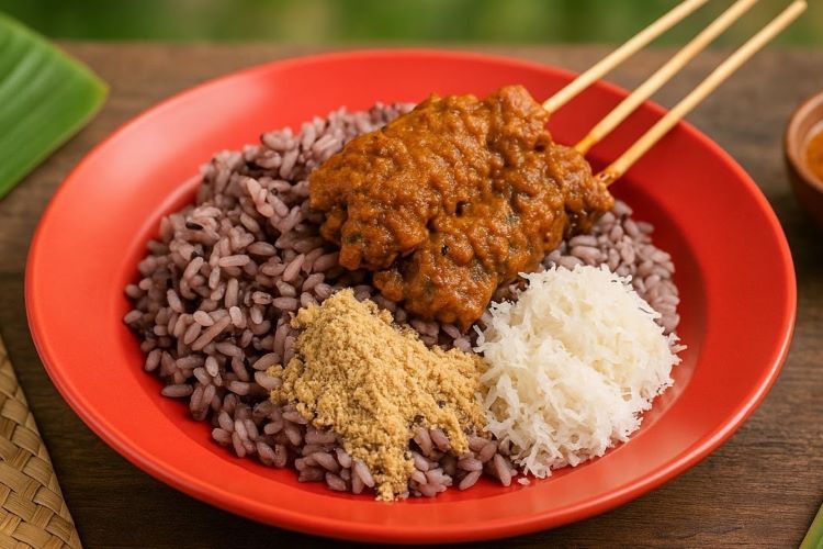 Nasi tersebut terdiri dari campuran beras putih dan ketan hitam, dilengkapi dengan parutan kelapa dan tepung kedelai, kemudian dinikmati bersama sate usus sapi yang sudah dimarinasi menggunakan bumbu rujak.